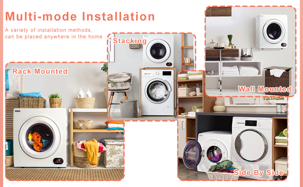 【Portable and safe】 With its compact size and handle, this portable dryer is ideal for small spaces such as apartments, dormitories, etc. It can be installed on a countertop, on a firm, level ground or mounted with a bracket (bracket not included). ETL and DOE certifications guarantee the safety and quality of our products.