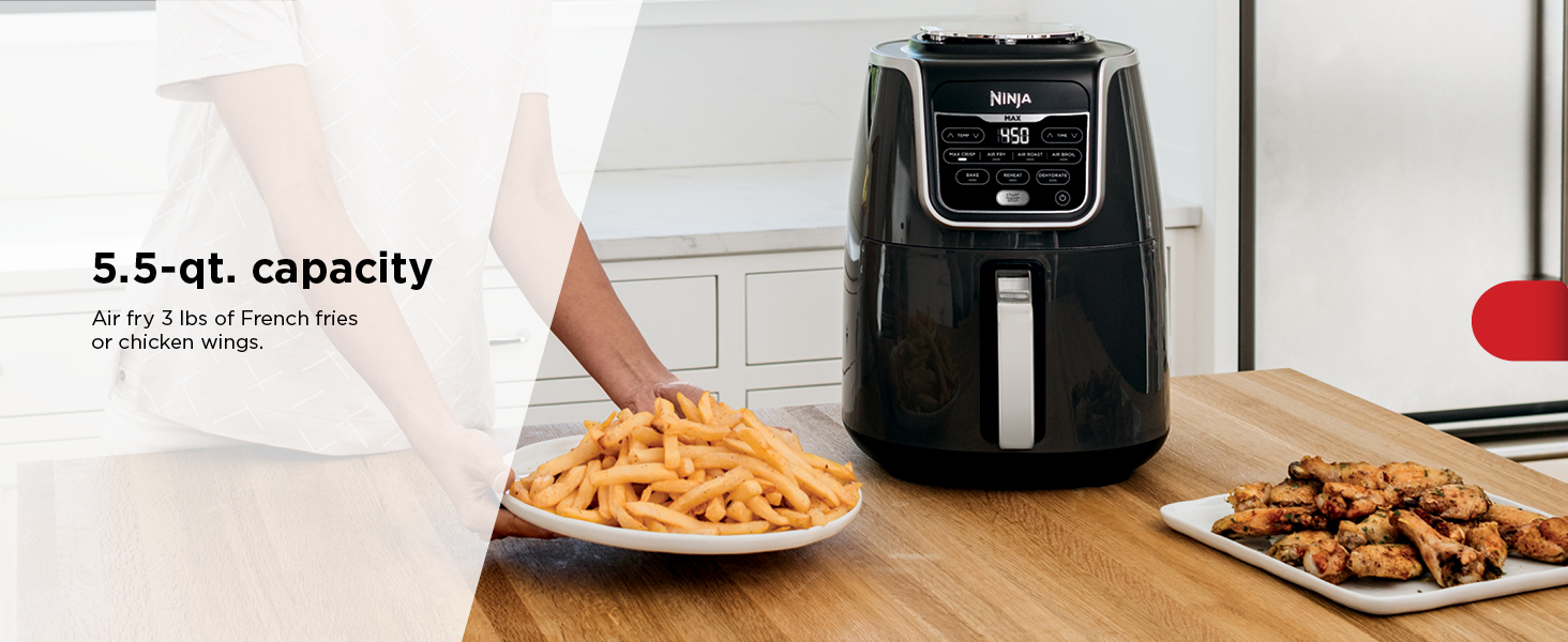 Meet the Ninja Air Fryer Max XL, a fast and easy way to cook your favorite foods. Cook and crisp 3 lbs of French fries, using little to no oil, in a family-sized 5.5-qt basket. MaxCrisp Technology delivers 450 degrees of superheated air to cook foods up to 30% faster (versus Ninja AF100), for hotter, crispier results with little to no oil for guilt free fried favorites.