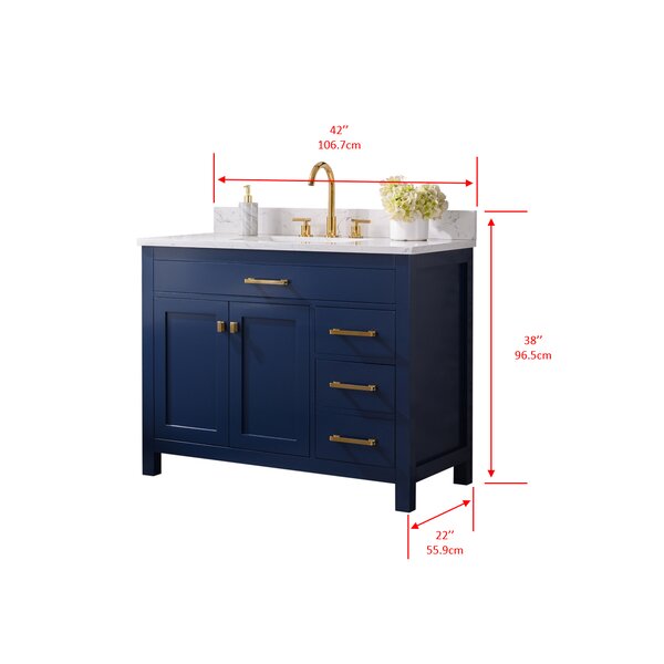 This transitional vanity combines contemporary lines to a traditional style. Maximize your bathroom space with this 42" vanity. Featuring a Carrara white engineered stone top on a solid wood frame.