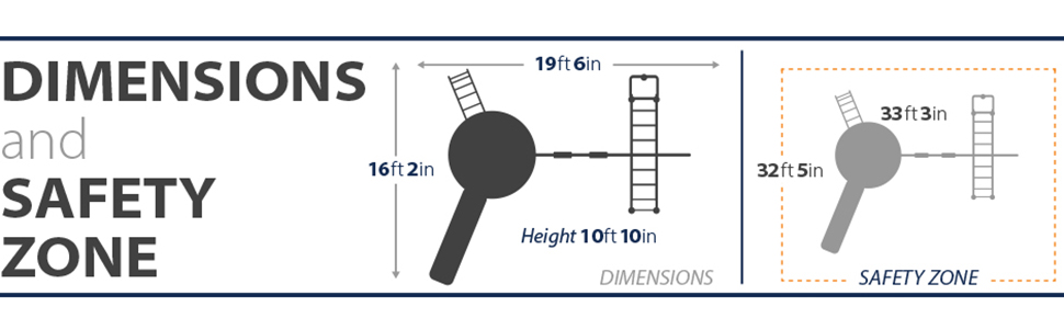- Playset footprint – 15’ 3" W x 10’ 9" D x 8’ 10" H | Recommended safety zone – 33’ 3” L x 32’ 5” W | Swings & Slide Weight Capacity – 150 lbs. | Platform Weight Capacity – 600 lbs. | For children between 3-12 years