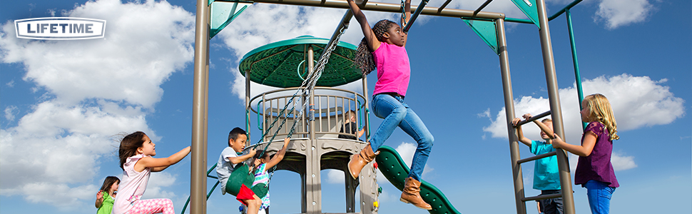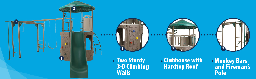 - Your purchase includes One Lifetime Adventure Tower Deluxe Playset in Green color | 9’ Wavy Slide, Monkey Bars, 1 Trapeze Bar, 2 swings, 2 climbing walls and Clubhouse with Hardtop Roof and 4 Storefronts