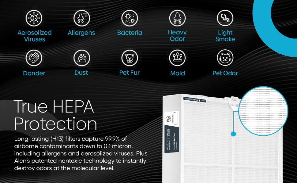 - B7 PURE FILTER: Alen's Pure HEPA filter helps remove airborne allergens, dust, pollen, dust mites, dander, pet hair, mold, and more. The True HEPA filter traps potentially harmful airborne particles as tiny as 0.1 micron. This office and home air purifier can purify up to 1,300 SqFt every 30 minutes.