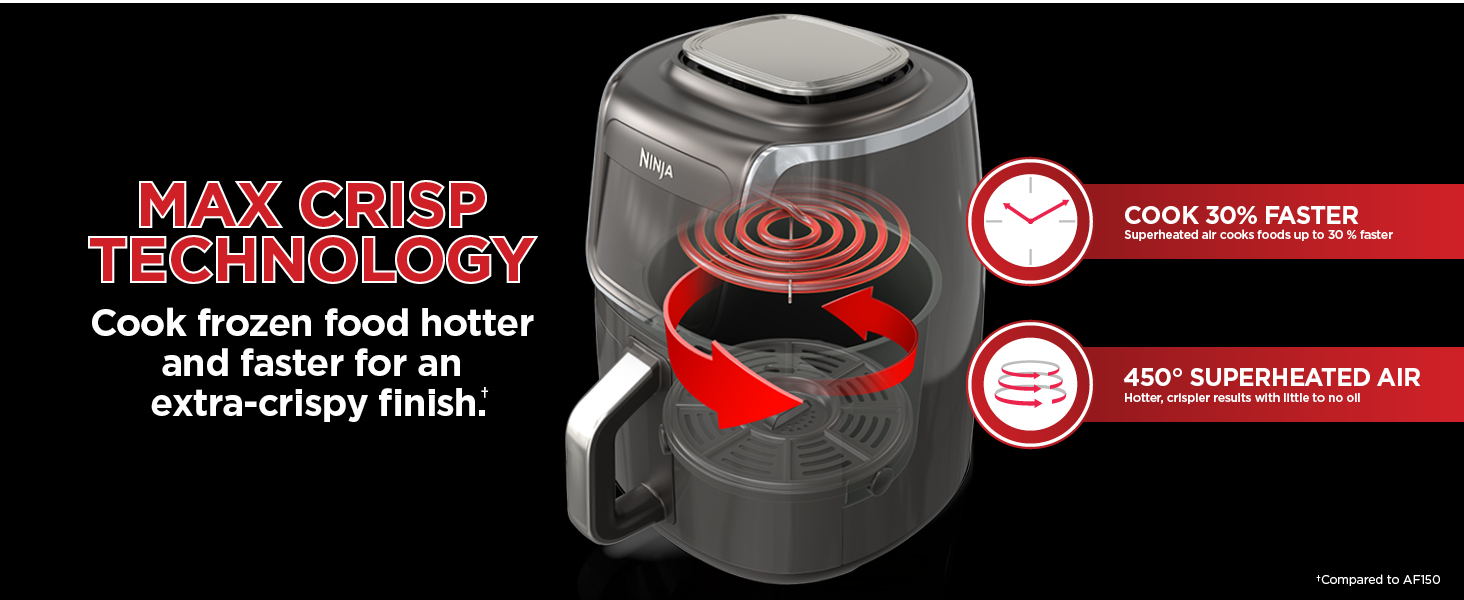 • MAX CRISP TECHNOLOGY: Delivers 450 degrees of superheated air to cook foods up to 30 % faster (Versus Ninja AF100) for hotter, crispier results with little to no oil for guilt free fried favorites.