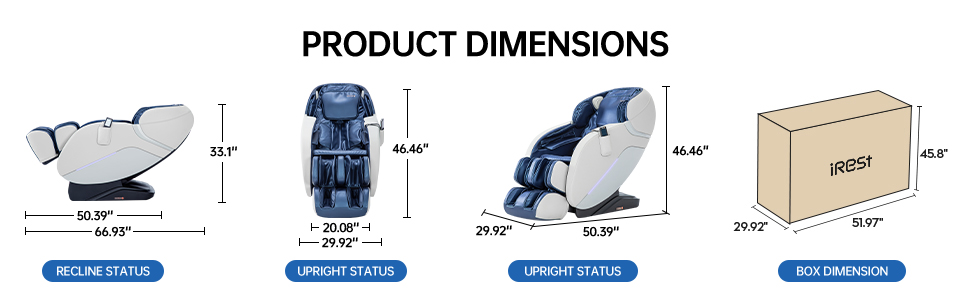 Product Dimension Upright status: 50.39"*29.92"*46.46" ; Recline status: 66.93"*29.92"*33.1"