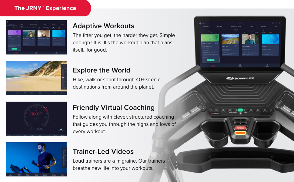 - The JRNY experience assesses your fitness level, creates custom workouts personalized to your unique capabilities, and provides coaching and feedback that guides you through your workouts – all from the built-in touchscreen